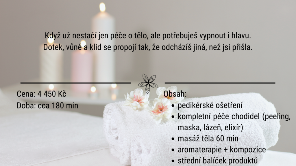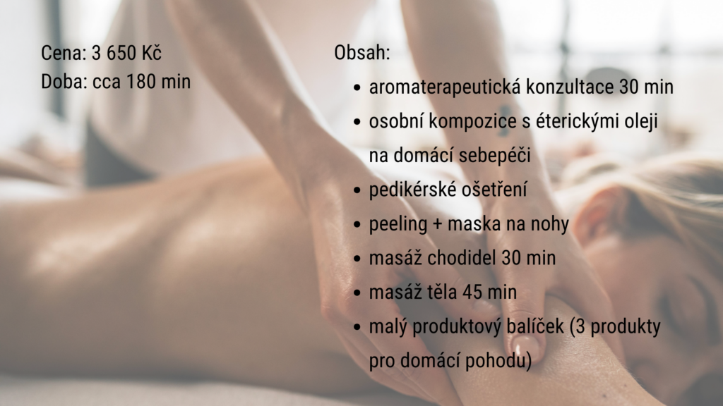 Masáž uvolní napětí, aromaterapie zklidní hlavu a ty se vrátíš sama k sobě — bez hluku, bez tlaku, bez výkonu.